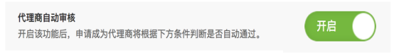 开启该功能后,申请成为代理商将根据下方条件判断是否自动通过。 选择关闭,申请成为代理商需要后台手动审核,审核通过后,会员成为代理商。 代理商设置中需要设置允许不存在上级代理商,才能设置是否自动审核; 开启自动审核后,可以设置自动审核后成为代理商的返佣比例和审核条件;