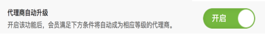 默认是关闭,不升级状态。代理商设置中需要设置允许不存在上级代理商,才能设置是否自动升级。开启按钮后,开启该功能后,会员满足下方条件将自动成为相应等级的代理商。 开启自动升级后,可以设置自动升级代理商等级后,代理商的返佣比例和升级条件; 会员符合条件后将自动成为该等级的代理商(如果代理模式选择仅支持地区代理商,不会自动升级)。当以下升级条件选择全部选择“或”时,只要满足其中一个条件就能升级。选择“与”时,则该条件必须要满足才能升级。