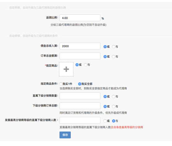 这两个条件只针对三级代理商升二级和二级代理商升一级。 代理商推荐数量:按照就近原则,计算该代理商推荐平级的人数,人数满足,则自动升级二级代理商或者三级代理商。通俗点理解就是增加平级推荐数量,当三级代理商推荐了下级成为和自己同级别的三级代理商就可以升级成为二级代理商。二级同理。 直属下级代理商推荐数量:一定要直属下级,直属下级要是同级别的代理商,为0为空不会升级。只有代理商的身份才会升级。 发展最高分销商等级的直属下级分销商人数:当前最高等级分销商的直属下级分销商人数,且和自己是同级别的分销商达到设置数量,则会升级。 这里说下,自动升级条件里有返佣比例设置,如果开启了自动升级的按钮,返佣比例是必须要设置的,不设置,即使升级条件满足了也不会升级。 注:只有代理商才有资格满足自动升级条件,会员,分销商,门店,员工,订货商,均不可以,但是被推荐成为平级代理商的身份可以是会员,分销商。