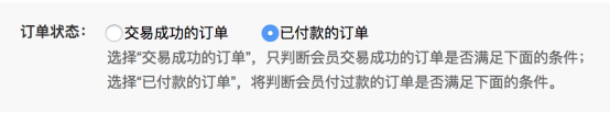 佣金总收入满:当分销商佣金达到设置金额后,则会升级。 订单总金额满:当购买商品的订单金额达到设置金额后,则会升级。 购买指定商品(一件或购买全部):商家可设置指定的商品,会员购买指定商品后,则会自动升级成为代理商。选择购买指定商品时增加“指定商品条件”购买1件或购买全部的选项。 当设置购买一件时,买家购买任意一件指定商品即满足条件(默认购买一件) 当设置购买全部时,买家必须购买全部全部指定商品才能满足升级条件。 下级分销商订单总额:当会员的下级分销商购买商品的订单总额达到设置金额后,则会升级。统计的是三级以内的分销订单总和。 以上这几个条件,升级是有前置条件的: 要根据选择的“订单状态”:“交易完成的订单”或“已付款的订单”来判断是否满足条件。 订单状态: