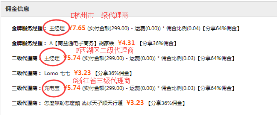 当代理模式选择区域代理优先:D下单购买商品到浙江省杭州市西湖区,E拿杭州市一级代理佣金,F拿西湖区二级代理佣金,G拿浙江省三级代理佣金;而ABC拿非区域分享机制佣金;