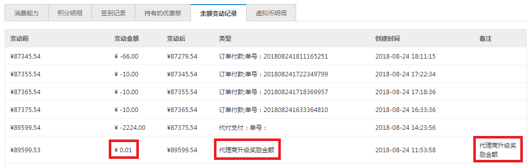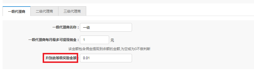 代理商等级增加“升到此等级奖励金额”,成为相应等级代理商(充值、升级、手动设置)会奖励一定金额(参考分销商等级奖励金额)。