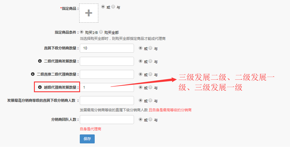 代理商自动升级增加“越级代理商发展数量”的条件
