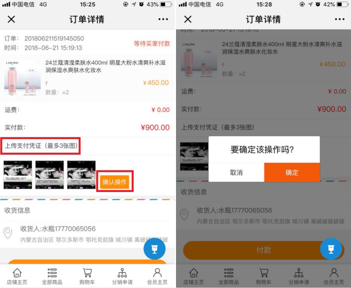 线下支付的订单,会员可以上传支付凭证,方便客户核对收款情况 线下支付的订单,可以选择上传支付凭证,最多可上传三张图,之后可选择是否确定此操作。
