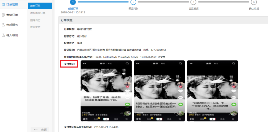 上传的支付凭证在后台订单详情中可查看: