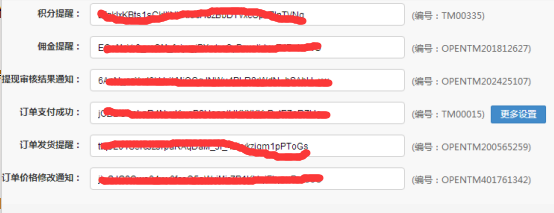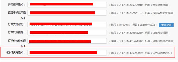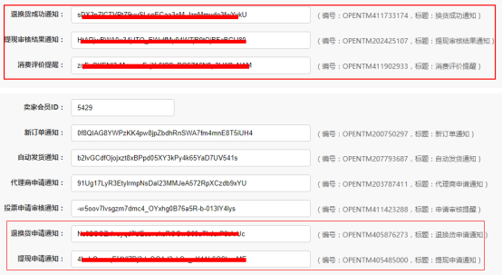操作步骤: 总部后台→设置→微信设置→模板消息:增加退换货申请通知、退换货成功通知、消费评价提醒、余额佣金提现申请通知和提现审核通过(包含供应商提现)通知。