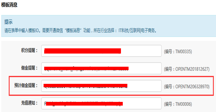 提示:请在表单中输入模板ID。需要开通微信“模板消息”功能,所在行业选择: IT科技/互联网|电子商务。