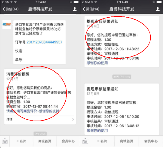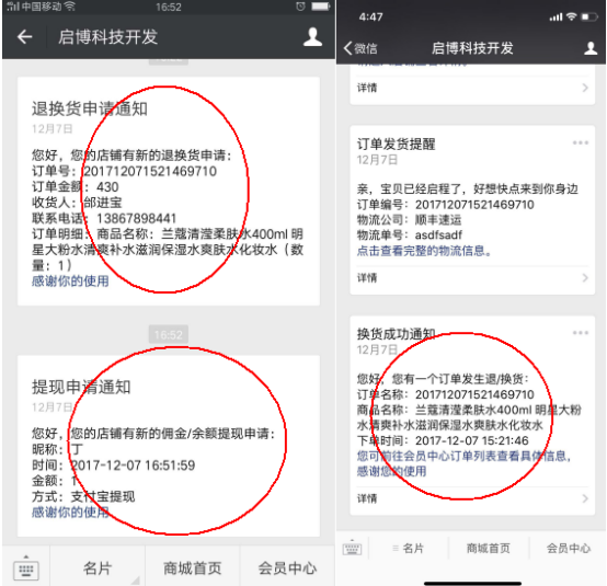 【新增】退换货申请通知、退换货成功通知、消费评价提醒、余额佣金提现申请通知和提现审核通过(包含供应商提现)通知