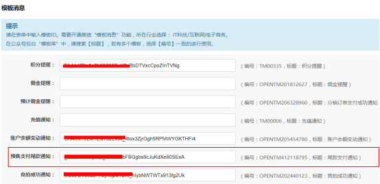 总部后台→设置→微信设置→模板消息:增加“预售支付尾款通知”模板消息,商家在公众号后台“模板库”中,请搜索【标题】,若有多个模板,选择【编号】一致的进行使用。