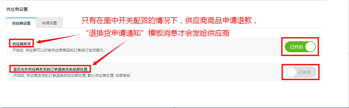操作步骤:总部后台→会员→供应商→供应商设置:只有在“供应商发货”开启、“是否允许供应商发货的订单退换货由总部处理”关闭的情况下,供应商商品申请退款(供应商已发货的情况下),“退换货申请通知”模板消息才会发给供应商。(注:仅限多店版,多店版的供应商才有退换货审核的功能)