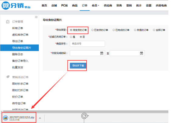 操作步骤: 总部后台→订单→订单管理→导出身份证图片:商家可按下单时间批量下载照片,导出的是压缩包,压缩包名字是随机生成的,下载后是一个个以订单号命名的文件夹,每个文件夹里含用户上传的照片,照片正面照是以back.jpg命名的,背面照是以front.jpg。