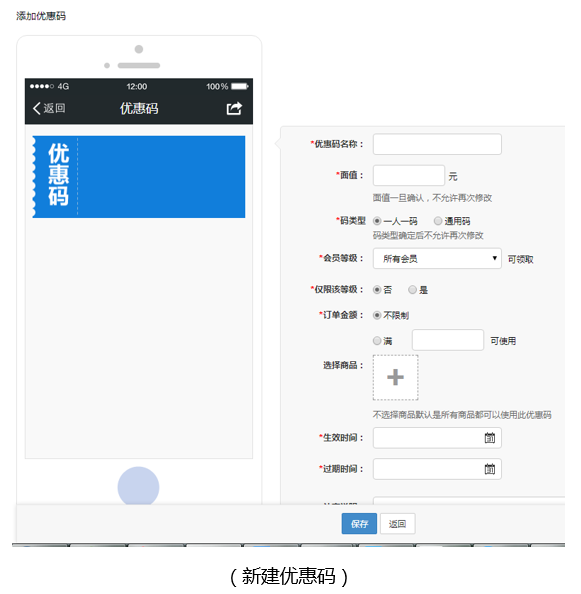 ① 新建优惠码,选择码类型 一人一码优惠码编号不同,通用码编号相同。