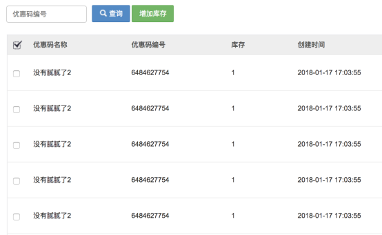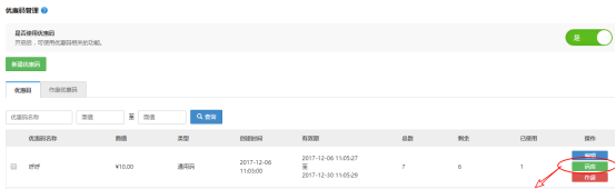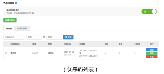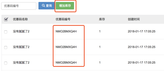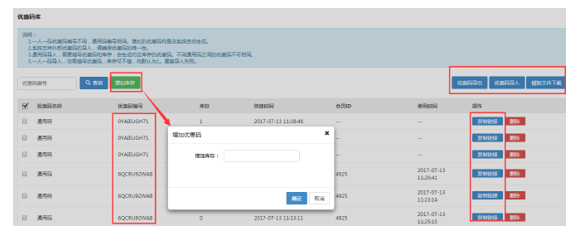 ② 点击“码库”进入优惠码库,添加优惠码库存后,系统自动生成优惠码编号和对应的链接