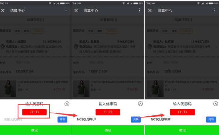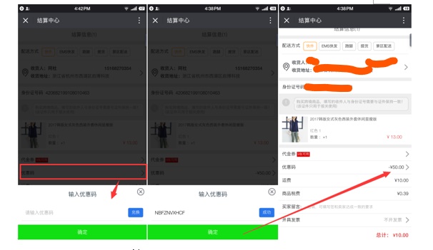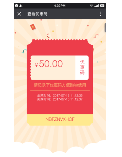 ⑤ 优惠码的应用场景-- 商家主要是通过线下的方式来推广优惠码。 比如:把优惠码做到卡片上,或者把优惠码链接通过转码器转换成二维码,或者把链接直接发给别人。 下图是通过链接打开的优惠码: