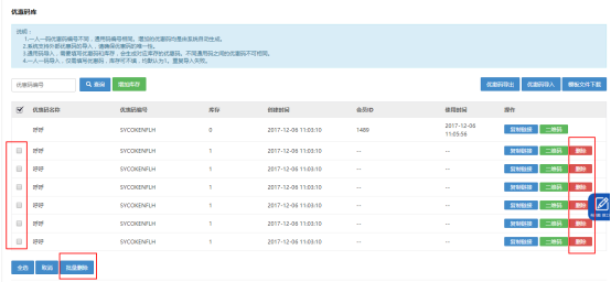操作步骤: 总部后台→营销→优惠营销→优惠码管理:点击优惠码的“码库”进入对应的“优惠码库”,可以批量删除未使用的优惠码,也可以针对某个优惠码单个删除,已经被使用的优惠码不能被删除。