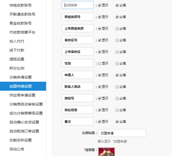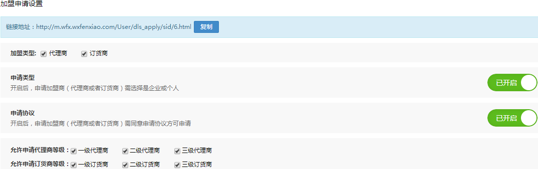 1。操作步骤: 总部后台→设置→系统设置:增加“加盟申请设置”,商家可以自定义“加盟类型”:代理商/订货商,当都勾选时,买家申请时可以选择加盟方式:申请代理商还是订货商,如果商家只勾选一个代理商,那么买家申请时就只能看到代理商申请的选项。 如果是代理商了就不能申请订货商,如果是订货商也不能申请代理商哦。