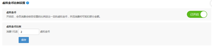 ① 虚拟币比例:商家可根据自我需求,选择是否启用消费送虚拟币功能,开启后,会员消费会按您设置的比例送出一定的虚拟金币;