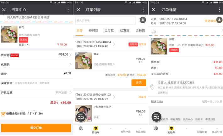周期购是一款可以切入“买家一次付款,商家多次发货”的消费场景的功能,帮助商家更高效地销售周期配送的商品,比如鲜花、牛奶、报刊等,帮助商家快速锁定客户、降低促销成本、高效回笼资金、提升单客价值。对于买家而言,则无需重复下单,还能享受更优惠的价格。商家可根据需求设置每日一期,每周一期、每月一期或者自定义周期配送周期时间。送达时间也可选择每周几。目前周期购配送方式有快递,商家可设置每期运费多少元或满几期包邮。