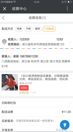 操作步骤: 周期购的商品如果设置了运费模板,那么买家购买时也可以选择对应运费模板中的配送方式,比如自提和门店配送都支持。