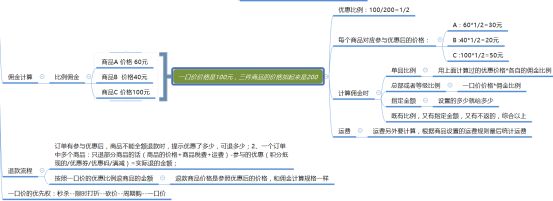 ③ 当买家一笔订单内选购的商品件数超出活动规则限定的件数,加入购物车结算时系统根据计算商品金额由高到低排列,优惠规则优先满足价格最高的商品,其余商品用户原价支付; ④ 单笔订单内,如果满足多次活动规则,则买家享受多次优惠,例如abc3件商品50元,买家这时候买了aabbcc6件商品,则只需支付100元即可全部拿走 ⑤ 佣金计算,运费,退款流程如下:
