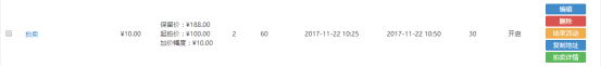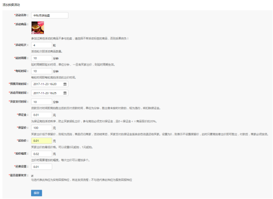 2)活动轮次:就是商家可以设置几轮活动,也就是活动商品的数量; 3)延时周期:即延长时间,一旦有买家出价,则延时周期生效,就是有人出价后,如果在延时周期内没人再出价,那么该轮活动结束,如果在延时周期内有人出价,那么该轮活动一直这样循环,直至延时周期内没人出价,该轮活动结束; 4)每轮时间:即每轮竞拍活动的出价时间。 如果延时周期设置为0,那么在每轮时间内,出价最高的将胜出。 如果延时周期不设置0,活动没人竞价时,本轮活动会根据每轮时间来结束活动,如果有人出价了,就会根据延时周期的循环来决定活动的结束。 5)预展开始时间: 预展时间开始前,商家可以编辑、删除、结束拍卖活动;