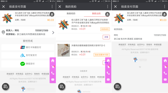 6)活动开始时间:活动开始后买家支付过保证金的可以点击出价大厅参与商品的出价竞选,没交保证金的买家可以先交保证金在参与出价竞选; 7)货款支付时间:即竞拍胜出后的支付货款时间,单位为分钟。胜出者未按时付款的,视为违约,将扣除保证金; 8)保证金:为保证竞拍活动秩序,防止买家胡乱出价,参与竞拍必须支付保证金,且0<保证金<=商品现价的20%;假如拍卖有2轮,买家A在第一轮时付了保证金并参与竞拍,竞拍胜出后支付货款时会减去保证金的金额,第一轮保证金减去后,A再参与该活动的第二轮拍卖则还需要再次缴纳保证金;如果A在第一轮的保证金没被减去,那么A参与第二轮竞拍时不需要在缴纳保证金。 9)保留价:买家出价低于保留价,则视为流拍,商品仍归商家,活动结束后,买家支付的保证金,系统会自动退还给买家。设置为0,则表示不设置保留价,此时只要竞拍者出价即可胜出,付款后,商家必须发货。 10)起拍价:买家出价的最低价格。可以设置0元起拍,1元起拍。设置0元起拍的话,买家拍价时会自动加上“加价幅度”; 11)加价幅度:出价时需要增加的幅度,每次出价可以增加多个幅度。 12)拍卖支付时目前只能用微信、支付宝和银联支付哦。