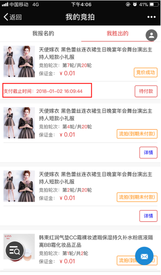 买家收到胜出消息后,可进商城在会员中心→拍卖:我的竞拍页面选择“我胜出的”便可查看到我在拍卖活动中拍到的商品,并可以看到支付截止时间(本轮活动结束时间加上支付货款的时间),这个时间会有0至15分钟的缓存时间。