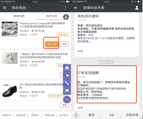 手机端增加确认收货按钮和拍卖订单发货提醒模板消息。
