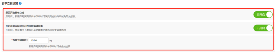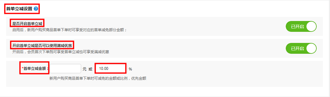 ①是否开启首单立减 ②开启后收单立减是否可以使用满减优惠 商家可选择是否开启首单立减,开启后,设置首单立减的金额,减多少由商家自己设置。新用户在手机端购买商品首次下单可享受减免部分金额。。 开启首单立减是否可以使用满减优惠,默认是关闭状态,开启后,新用户在使用首单立减的优惠时可同时享受满减的优惠(只针对满减优惠),付款完成后,订单详情页也会显示对应的优惠信息。下单未付款,付款后退款后将不会在享受首单立减的优惠。