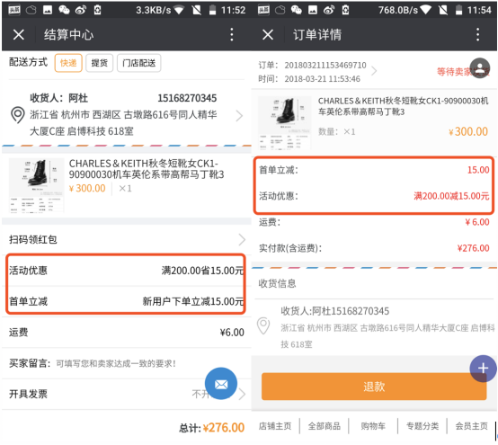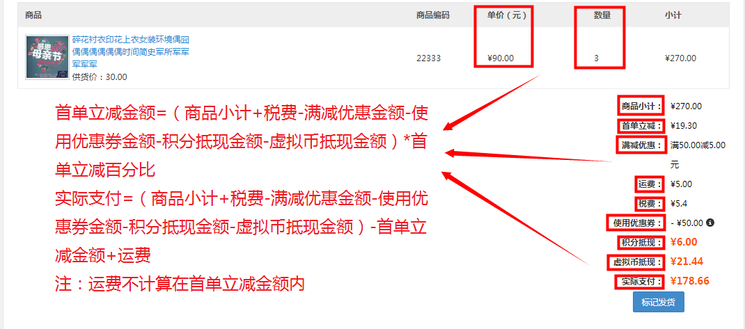 首单立减计算规则如下(下图中首单立减百分比为10%):运费不计算在首单立减金额内。