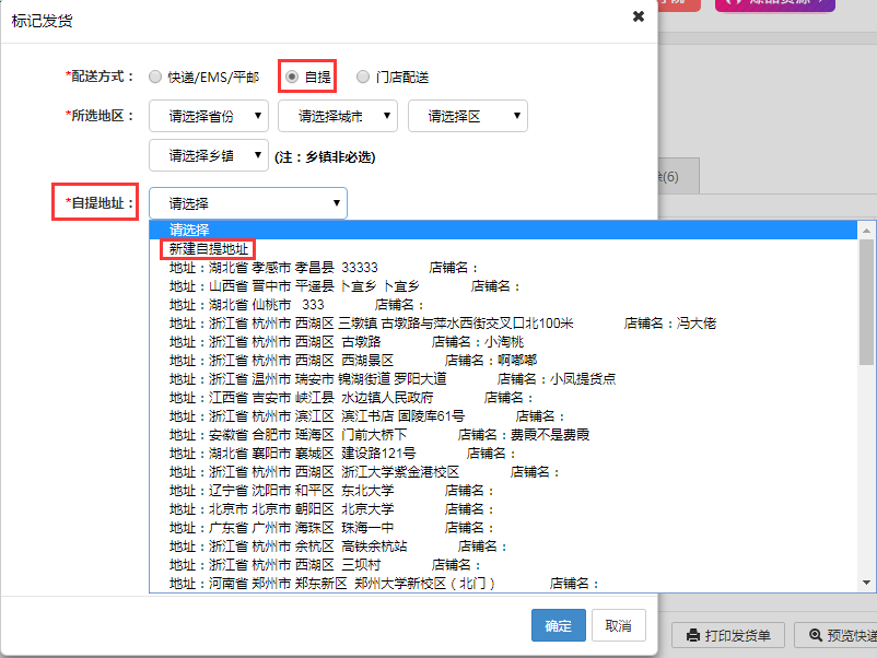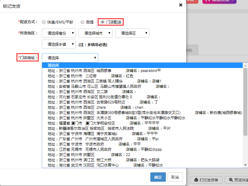 积分兑换商品订单标记发货时可以选择“自提”和“门店配送