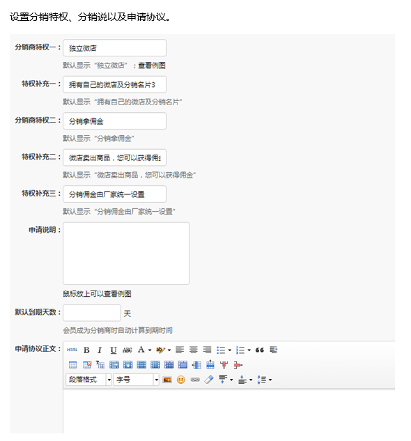 分销商申请的申请条件显示页面用户可以自定义编辑,备注信息也可以自己增加条数
