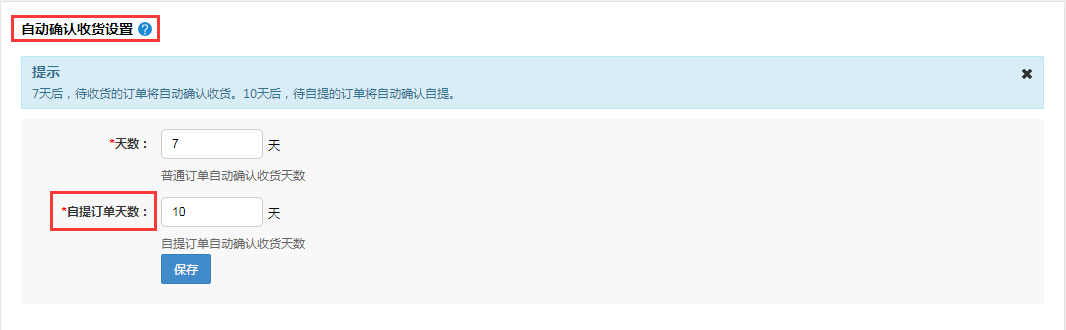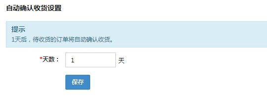 自动确认收货设置:可以设置代收货的的订单在多少天之内自动变成确认收货。