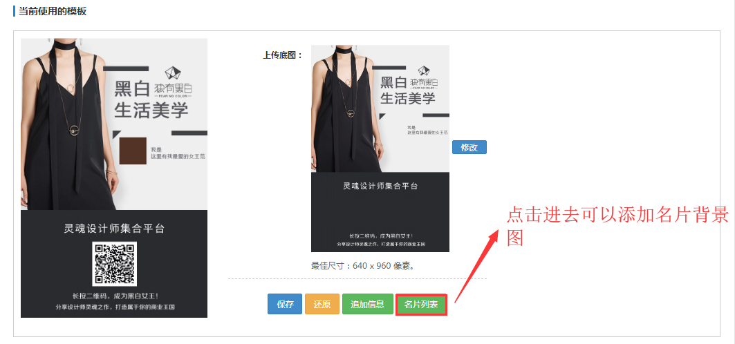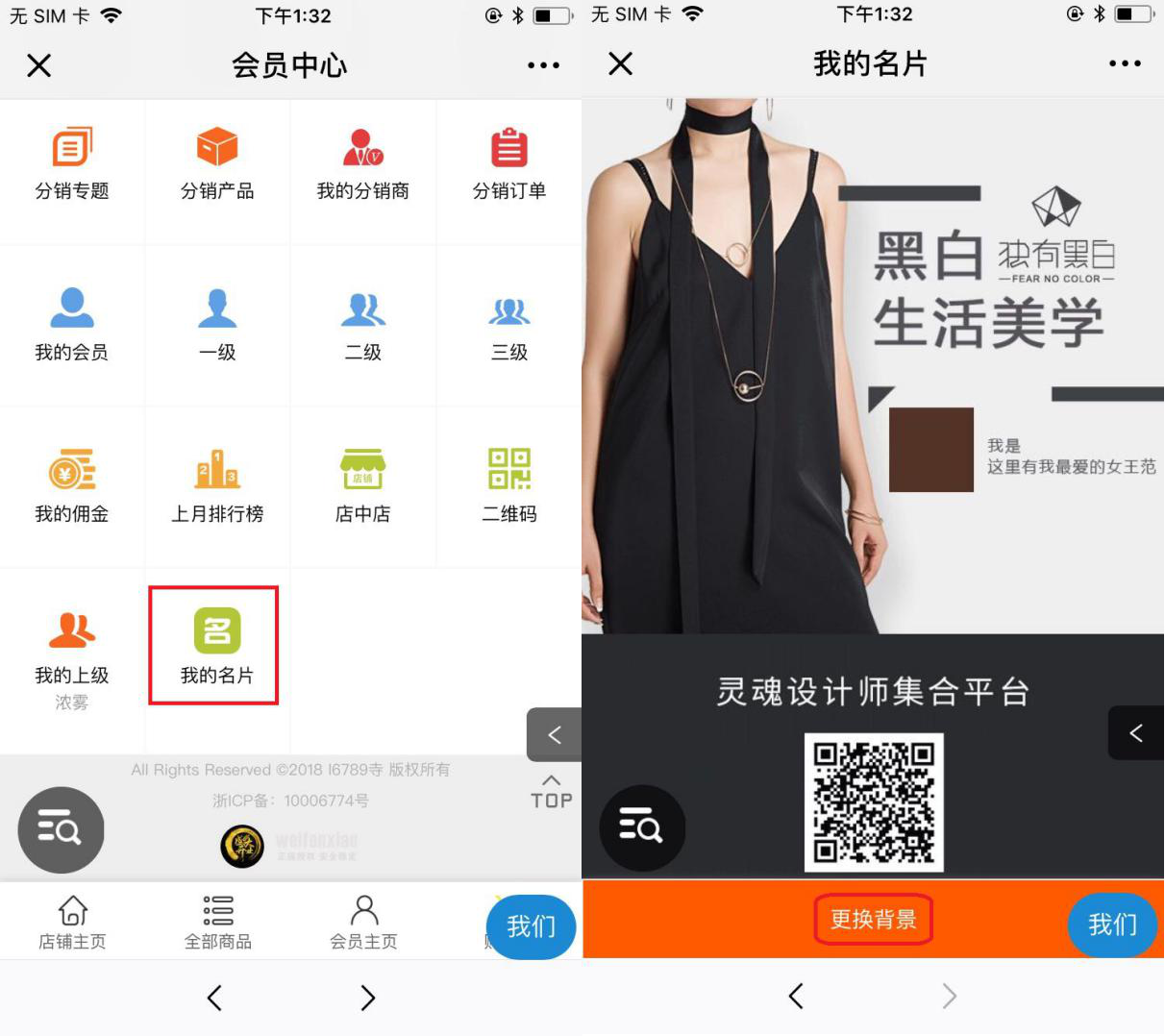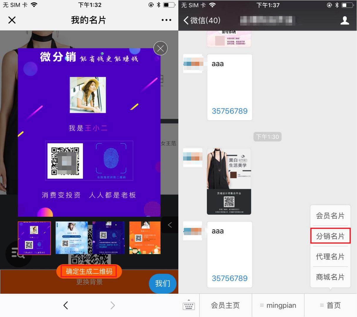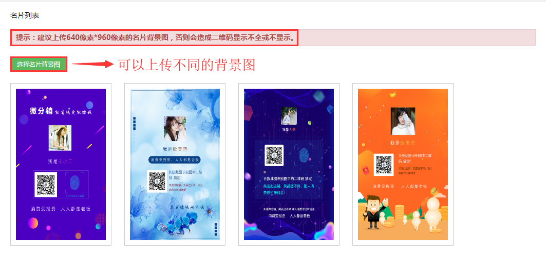 3.分销名片中新增“名片列表”,可以在名片列表中添加背景图。手机端分销中心中新增“我的名片”,可以在我的名片中选择不同的背景图来设置分销名片,设置好的分销名片在公众号中会展示出来。