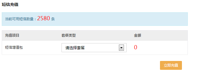 短信充值:可以看到可用的短信条数量,可以选择套餐进行短信条数的充值。