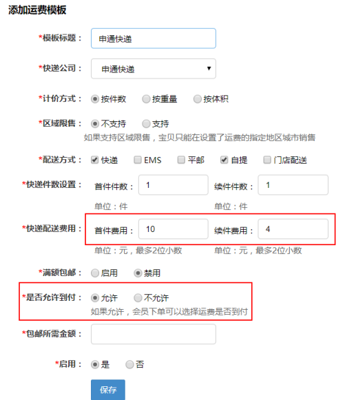 操作步骤: 总部后台→设置→物流管理→运费模板:添加/编辑运费模板时增加运费“是否允许到付”,默认不允许,选择允许时,下单选择使用该运费模板的商品时,买家可以选择运费是否到付。供应商的运费模板暂时不做优化。 案例:运费模板到付(运费模板快递首件10元)的商品A和其他商品一起下单时: ① A和固定运费(12元)的商品B一起下单时不能选择运费到付; ② A和包邮的一起下单时,可以选择运费到付; ③ A和选择其他运费模板运费到付的商品一起下单时,可以选择运费到付; ④ A和选择其他运费模板运费不到付的商品一起下单时,不可以选择运费到付。 ⑤ 到付的运费买家都很清楚,收货时直接给订单中显示的运费就可以了,避免被多收或者少收。