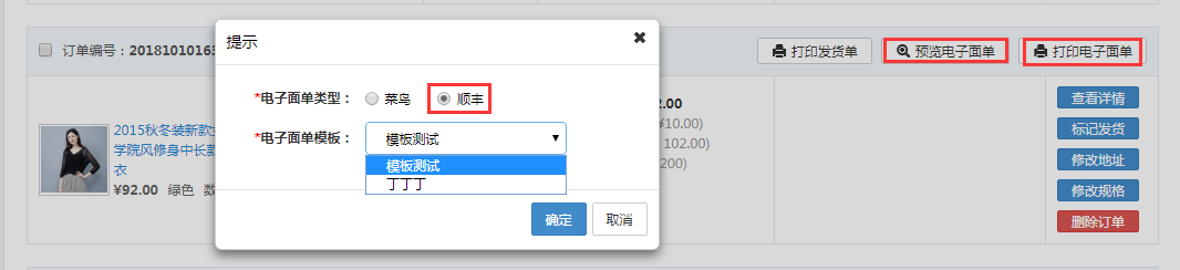 订单列表中“预览电子面单”及“打印电子面单”可以选择顺丰电子面单: