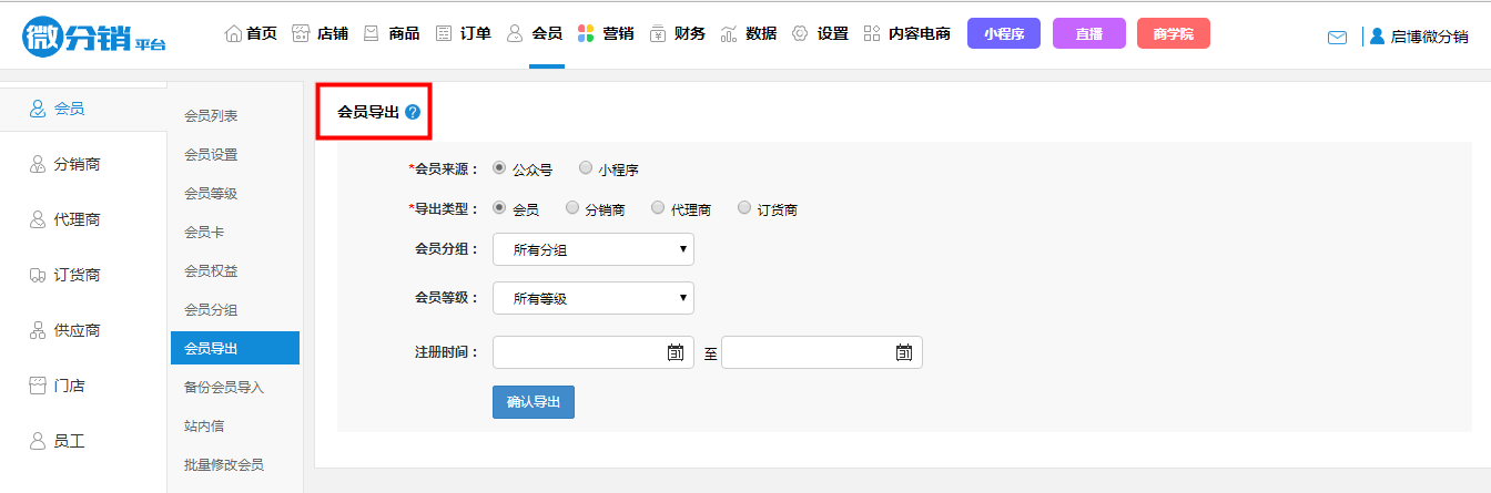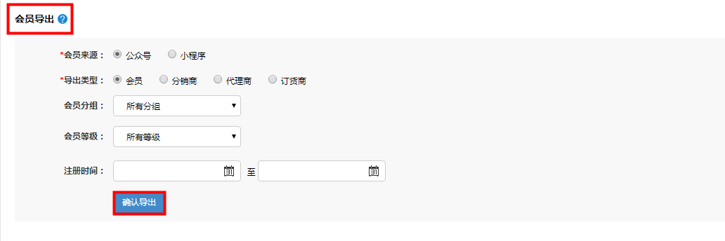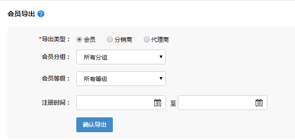 会员导出:可以根据会员、分销商、代理商的一个注册时间来进行一个范围导出。不选择时间就导出全部
