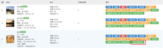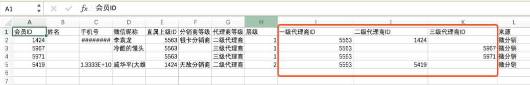 操作步骤: 总部后台→会员→会员管理→会员列表:选择“导出全部下级”时,增加导出全部下级可以显示下级的一级代理商ID,二级代理商ID,三级代理商ID