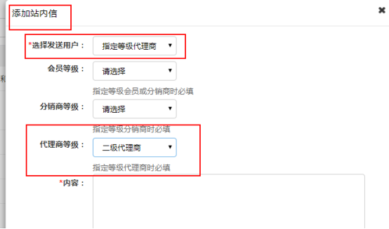 站内信群发增加选择代理商等级 操作步骤: 总部后台→营销→消息群发:站内信群发增加选择代理商等级。