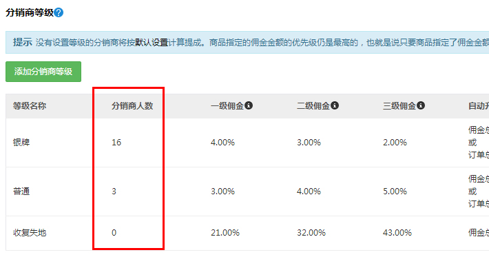 分销商等级可以用户自己进行添加,可以设置一个相应等级对应相应佣金的特权,升级可以根据佣金的多少或者订单总额达到多少来考量。