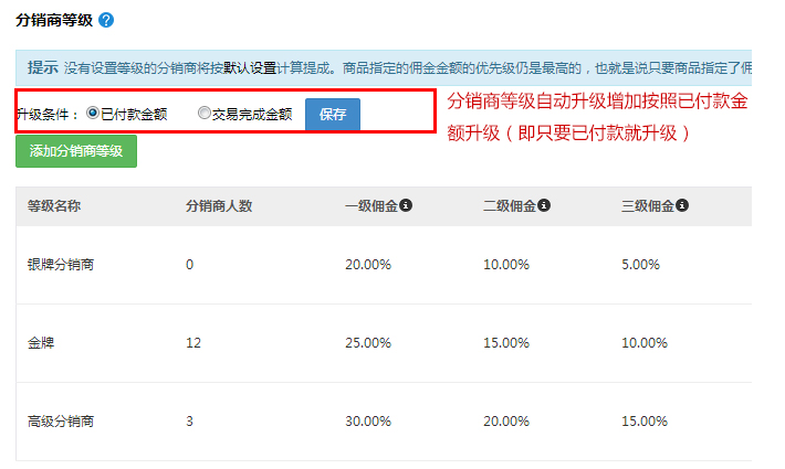 分销商等级自动升级条件分为”已付款金额“和”交易完成金额“两种