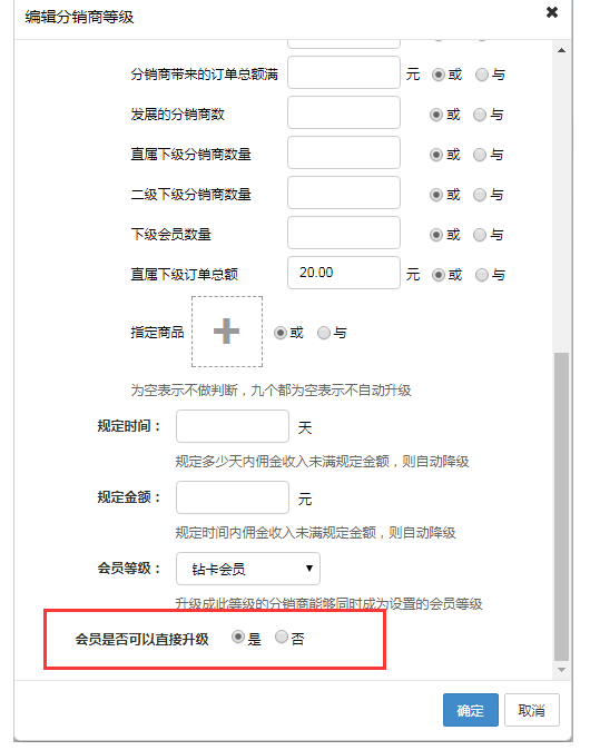 分销商等级增加“会员是否可以直接升级”的设置 如果选择是,会员满足条件将自动成为该等级的分销商