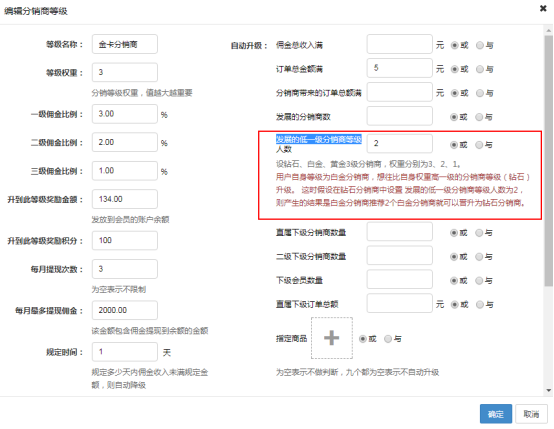 分销商自动升级增加“发展的低一级分销商等级”条件