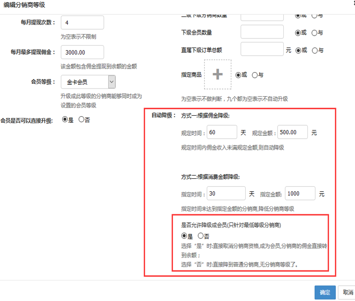 ① 根据消费金额降级:指定时间未达到指定金额的分销商,降低分销商等级 ② 分销等级最低时,没达到规定时间里规定金额的条件,可以设置是否直接取消其分销商资格降为会员。