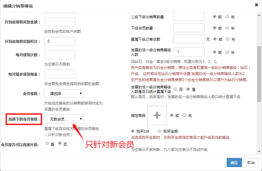 分销商等级里可以设置该等级的分销商发展进来的直属下级自动成为某个会员等级(只针对新会员)