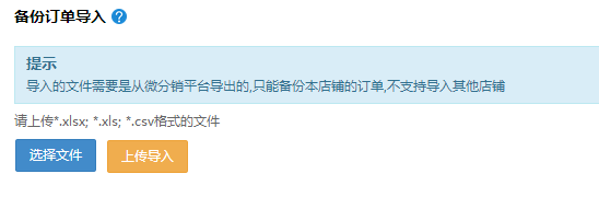 备份订单导入数据只支持微分销系统的备份数据,不支持其他店铺的数据导入。请按系统提示的文件格式上传。如下图所示: