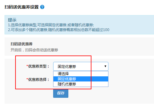 ① 扫码送优惠券加一个配置项,可以选择固定优惠券或者随机优惠