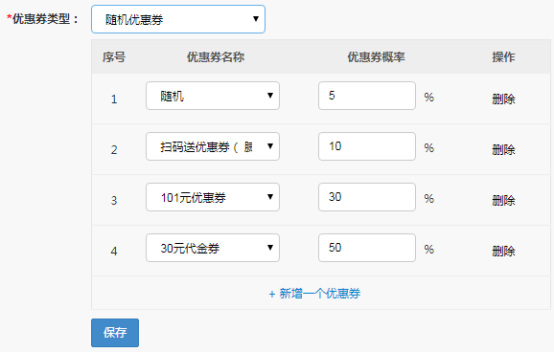 ② 当选择随机优惠券之后,加一个优惠券多选按钮,选中优惠券后面跟上对应抽中概率,扫码后,根据概率发放随机优惠券