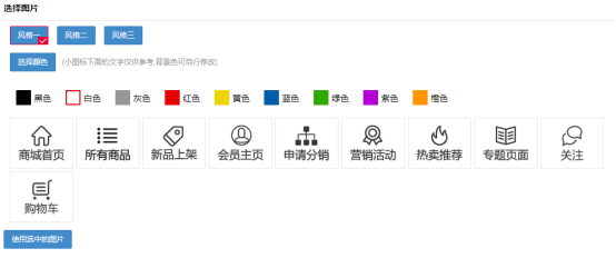 选择“小图标导航”时,除了设置链接地址、导航名称以外,还要设置好文字的颜色、背景颜色,以及图标的上传。图标制作建议尺寸为60*60px。图标可以自定义上传,点击“上传”按钮进行自定义上传。也可采用系统默认的图标样式,点击“修改”按钮选择系统默认样式。系统默认图标样式如下图:
